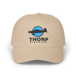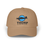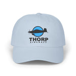 The Thorp Aircraft Logo hat in light colors with an embroidered logo. This high quality hat is made from 100% cotton and offers a soft and breathable feel that's perfect for all-day wear. Its unstructured design and low-profile fit give it a laid-back vibe, while the antique brass buckle closure adds a touch of vintage charm. The matching undervisor and four-row stitching on the visor provide subtle yet stylish details. With six panels and a Permacurv® visor, this cap offers a perfect blend of durability and classic aesthetics.